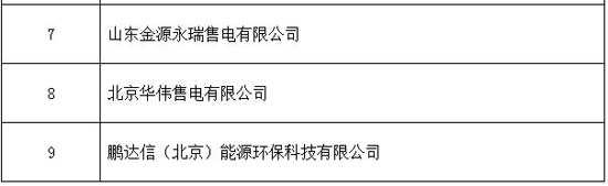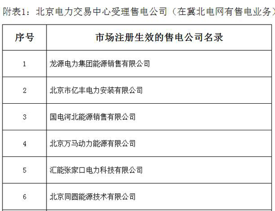 冀北電力交易中心有限公司于2017年10月19日至2017年11月19日共對(duì)13家售電公司進(jìn)行了公示,具體為:北京電力交易中心受理并在冀北電網(wǎng)有售電業(yè)務(wù)的龍?jiān)措娏瘓F(tuán)能源銷售有限公司等9家售電公司;北京電力交易中心推送業(yè)務(wù)范圍變更至冀北的北京經(jīng)開智控能源管理股份有限公司等4家售電公司。